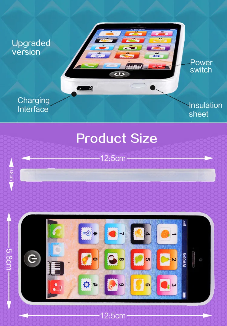 1,Great Educational Toy: When pressing the button of the simulated mobile phone toy, the lights will flash in various colors on the edge, which is very visually stimulating. It will enlighten children to see, hear, touch, observe and explore cognition.